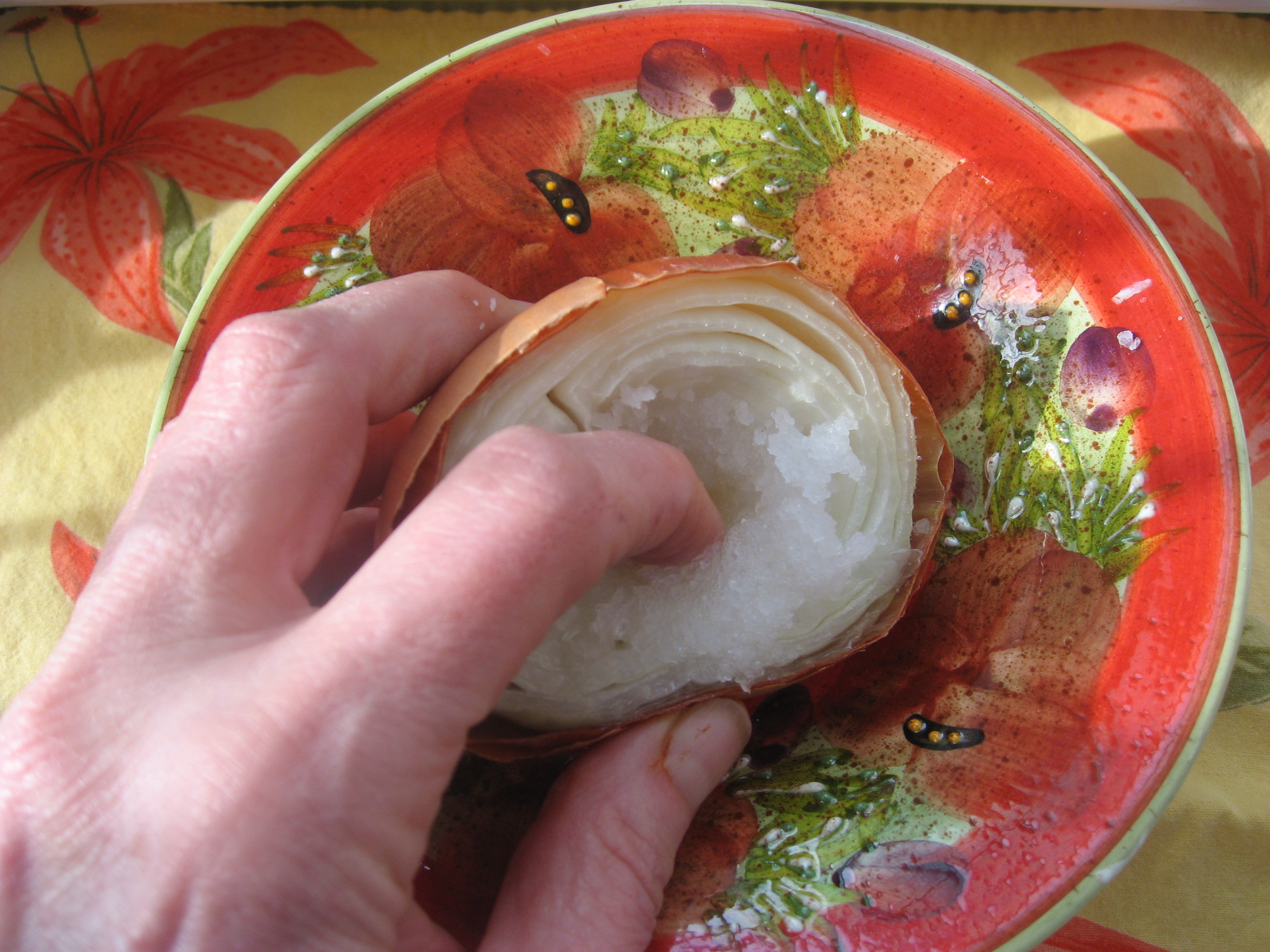 Hollow out a half of onion and fill the middle with salt. Let it sit overnight so the salt absorbs the onion’s magic juices.